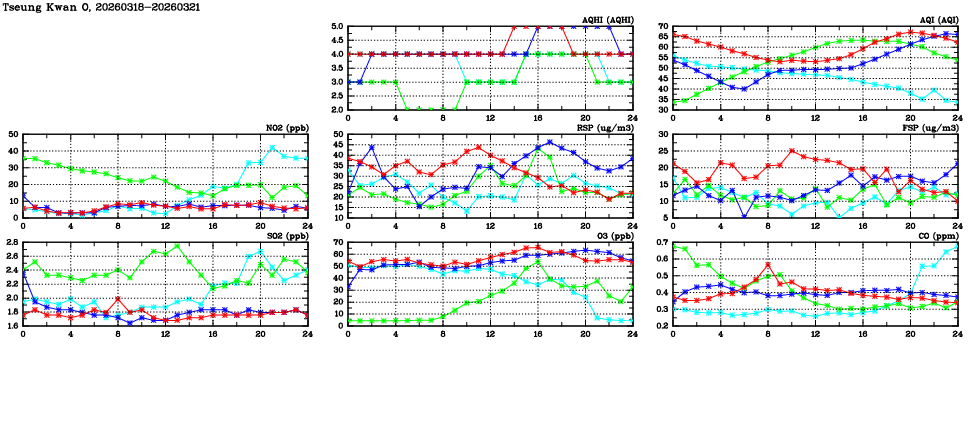 | Air Quality Data Time Series in Tseung Kwan O (2026/03/21) | ( Line colors: Day -3 Day -2 Day -1 Current day ) | 2D Map Current AQHI |
