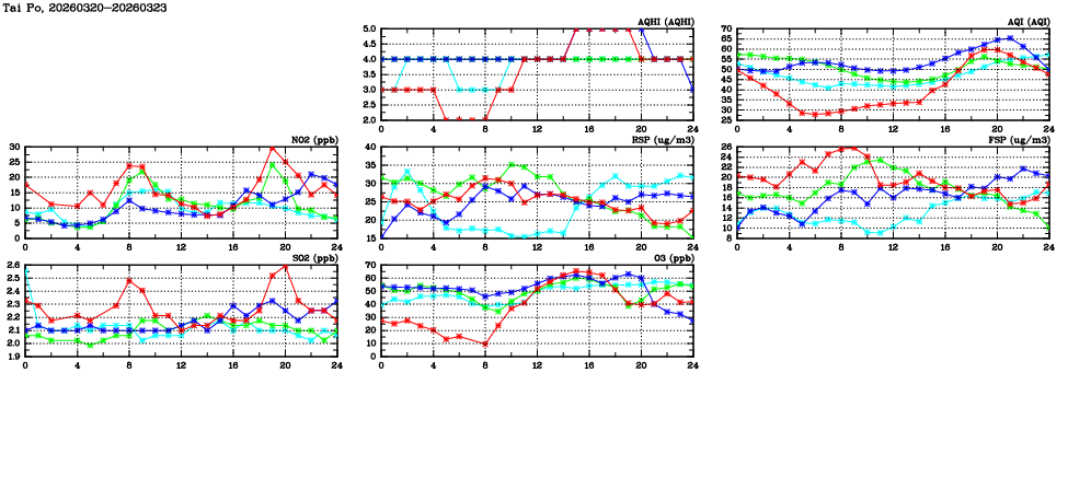 | Air Quality Data Time Series in Tai Po (2026/03/23) | ( Line colors: Day -3 Day -2 Day -1 Current day ) | 2D Map Current AQHI |