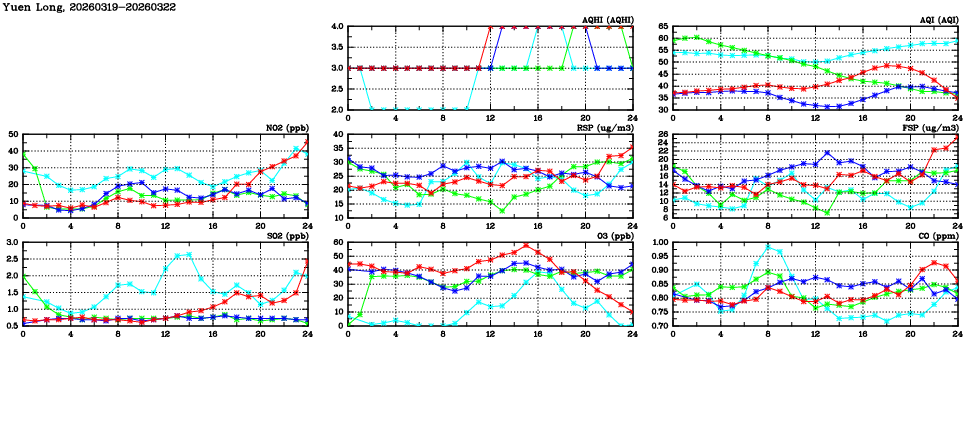 | Air Quality Data Time Series in Yuen Long (2026/03/22) | ( Line colors: Day -3 Day -2 Day -1 Current day ) | 2D Map Current AQHI |