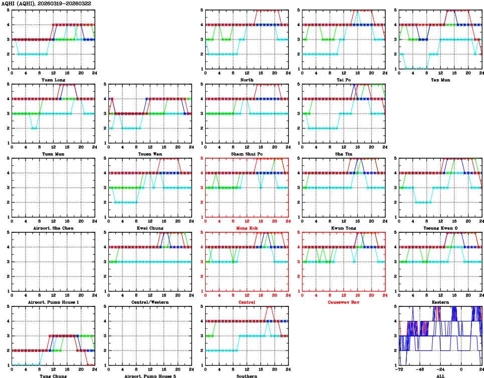| Air Quality Data Time Series for AQHI (2026/03/22) | ( Line colors: Day -3 Day -2 Day -1 Current day ) | 2D Map Current AQHI |