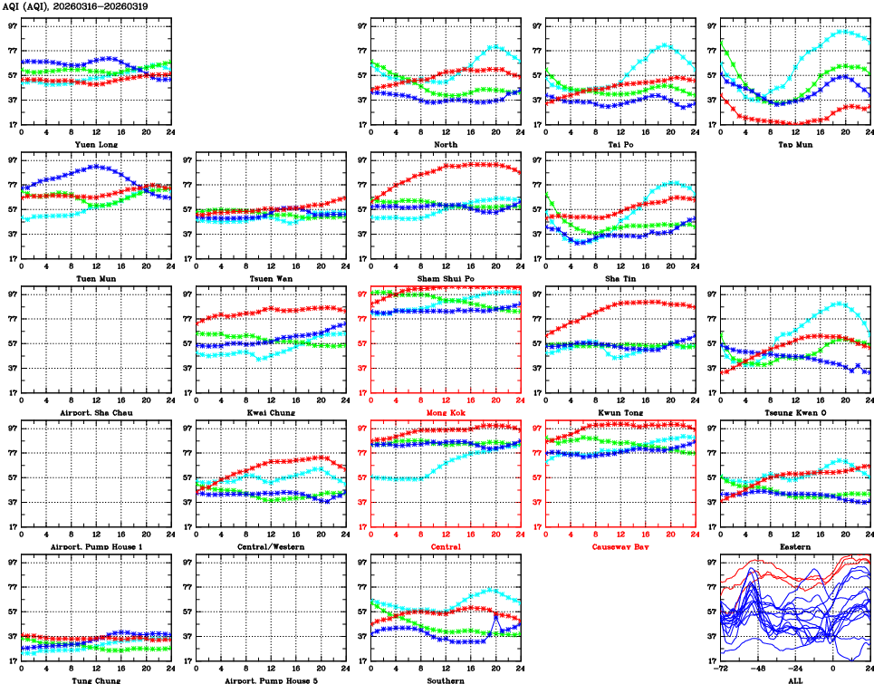 | Air Quality Data Time Series for AQI (2026/03/19) | ( Line colors: Day -3 Day -2 Day -1 Current day ) | 2D Map Current AQHI |