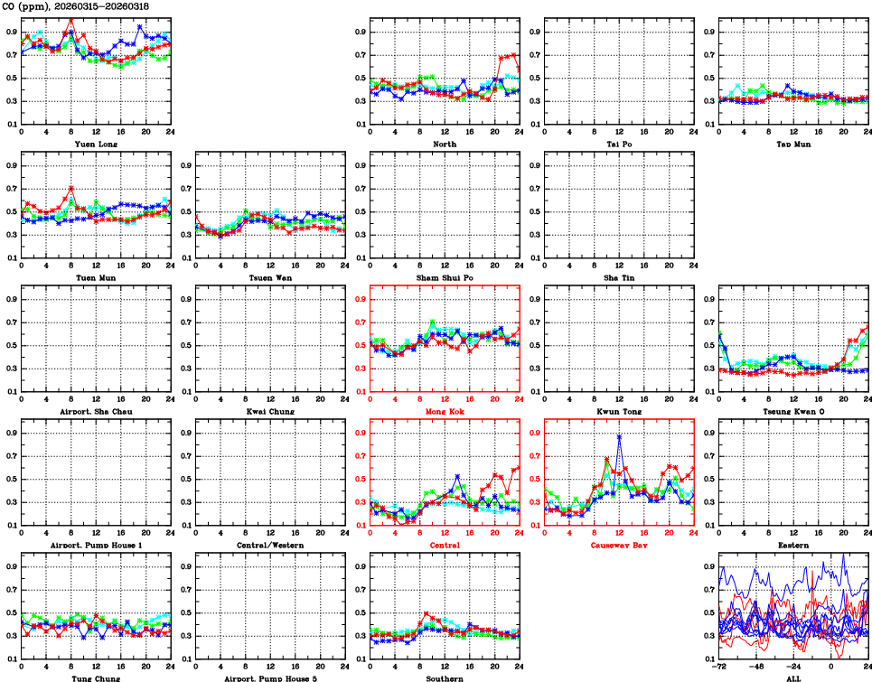 | Air Quality Data Time Series for CO (2026/03/18) | ( Line colors: Day -3 Day -2 Day -1 Current day ) | 2D Map Current AQHI |