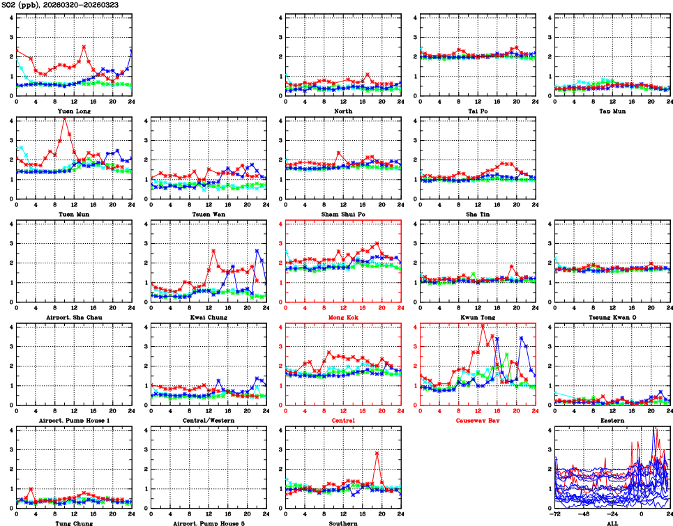 | Air Quality Data Time Series for SO2 (2026/03/23) | ( Line colors: Day -3 Day -2 Day -1 Current day ) | 2D Map Current AQHI |