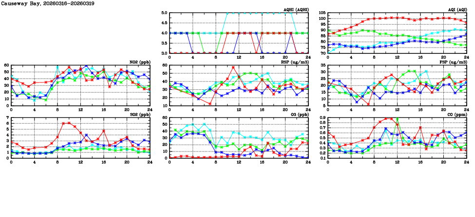 | Air Quality Data Time Series in Causeway Bay (2026/03/19) | ( Line colors: Day -3 Day -2 Day -1 Current day ) | 2D Map Current AQHI |
