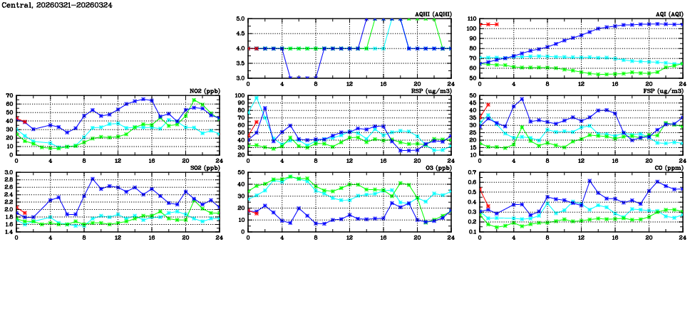 | Air Quality Data Time Series in Central (2026/03/24) | ( Line colors: Day -3 Day -2 Day -1 Current day ) | 2D Map Current AQHI |
