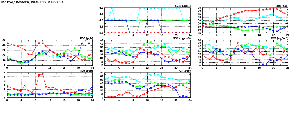 | Air Quality Data Time Series in Central/Western (2026/03/19) | ( Line colors: Day -3 Day -2 Day -1 Current day ) | 2D Map Current AQHI |