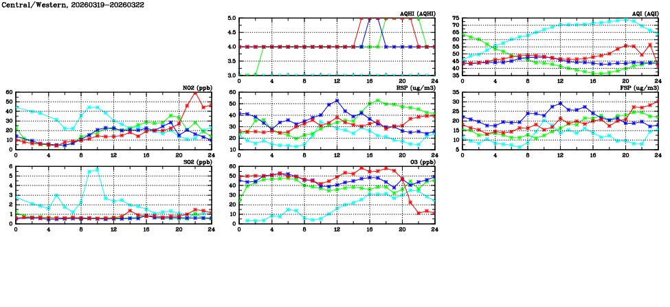 | Air Quality Data Time Series in Central/Western (2026/03/22) | ( Line colors: Day -3 Day -2 Day -1 Current day ) | 2D Map Current AQHI |