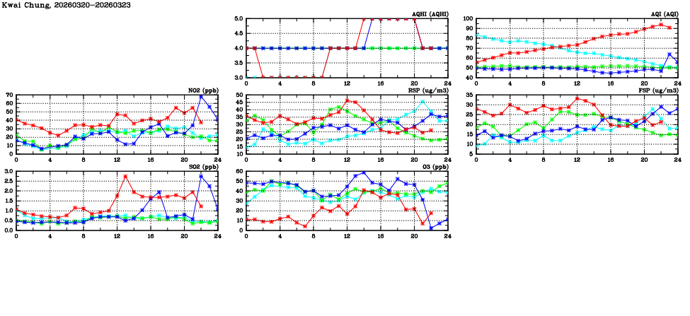 | Air Quality Data Time Series in Kwai Chung (2026/03/23) | ( Line colors: Day -3 Day -2 Day -1 Current day ) | 2D Map Current AQHI |