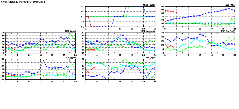 | Air Quality Data Time Series in Kwai Chung (2026/03/24) | ( Line colors: Day -3 Day -2 Day -1 Current day ) | 2D Map Current AQHI |