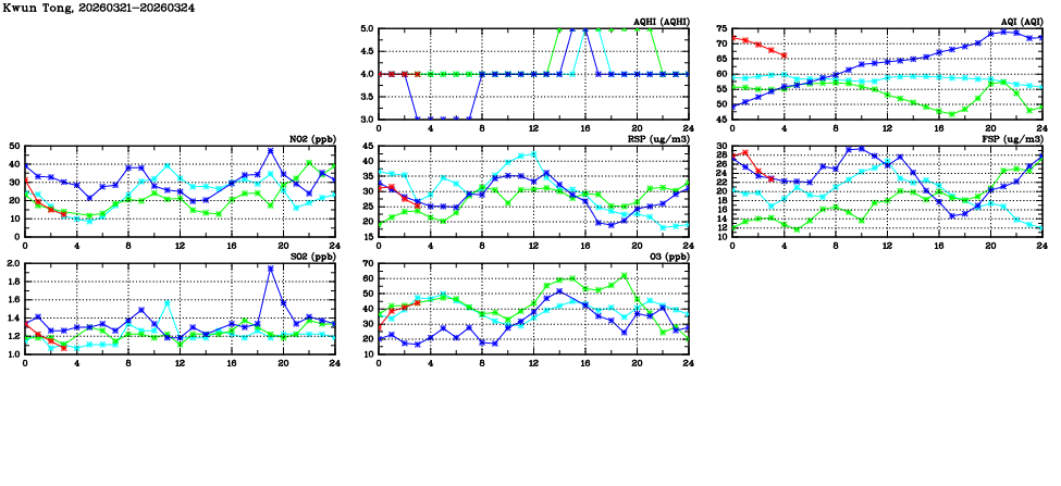 | Air Quality Data Time Series in Kwun Tong (2026/03/24) | ( Line colors: Day -3 Day -2 Day -1 Current day ) | 2D Map Current AQHI |