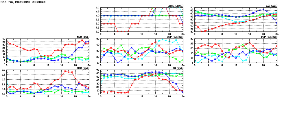 | Air Quality Data Time Series in Sha Tin (2026/03/23) | ( Line colors: Day -3 Day -2 Day -1 Current day ) | 2D Map Current AQHI |