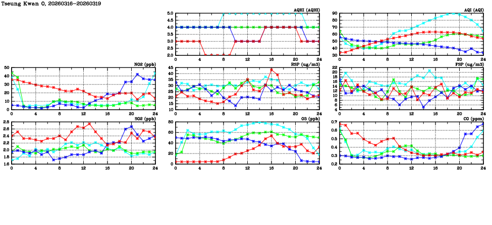 | Air Quality Data Time Series in Tseung Kwan O (2026/03/19) | ( Line colors: Day -3 Day -2 Day -1 Current day ) | 2D Map Current AQHI |