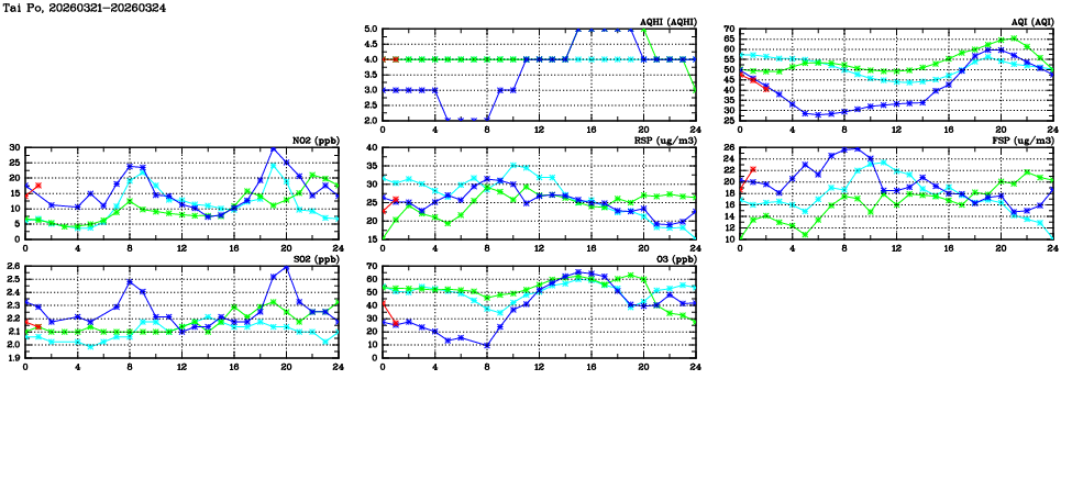 | Air Quality Data Time Series in Tai Po (2026/03/24) | ( Line colors: Day -3 Day -2 Day -1 Current day ) | 2D Map Current AQHI |