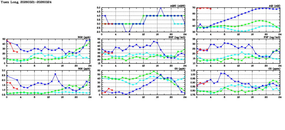 | Air Quality Data Time Series in Yuen Long (2026/03/24) | ( Line colors: Day -3 Day -2 Day -1 Current day ) | 2D Map Current AQHI |