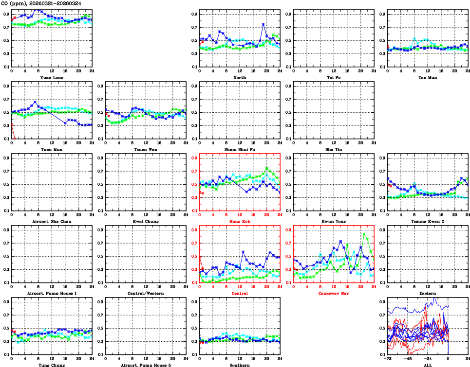 | Air Quality Data Time Series for CO (2026/03/24) | ( Line colors: Day -3 Day -2 Day -1 Current day ) | 2D Map Current AQHI |