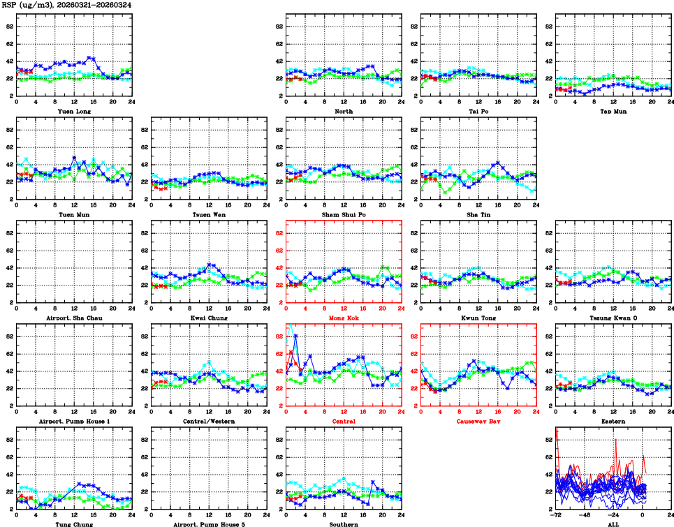 | Air Quality Data Time Series for RSP (2026/03/24) | ( Line colors: Day -3 Day -2 Day -1 Current day ) | 2D Map Current AQHI |