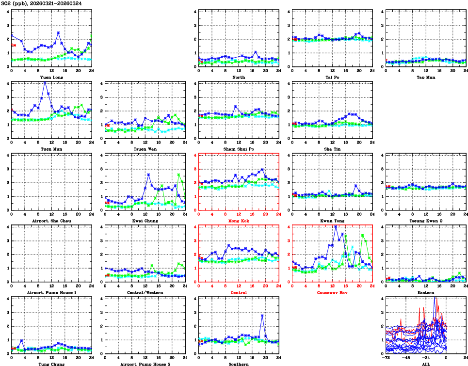 | Air Quality Data Time Series for SO2 (2026/03/24) | ( Line colors: Day -3 Day -2 Day -1 Current day ) | 2D Map Current AQHI |
