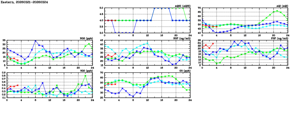 | Air Quality Data Time Series in Eastern (2026/03/24) | ( Line colors: Day -3 Day -2 Day -1 Current day ) | 2D Map Current AQHI |