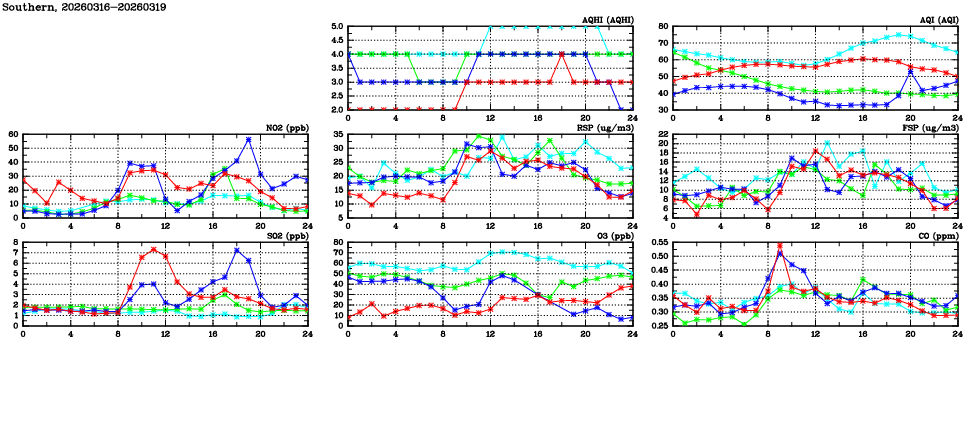 | Air Quality Data Time Series in Southern (2026/03/19) | ( Line colors: Day -3 Day -2 Day -1 Current day ) | 2D Map Current AQHI |