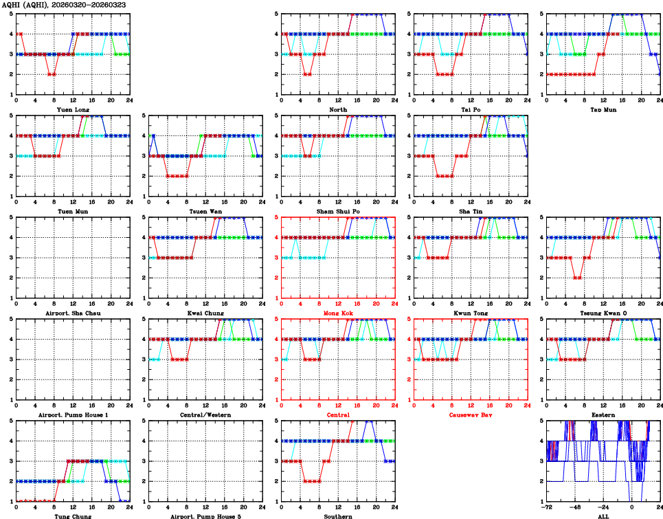 Air Quality Data Time Series for AQHI (2026/03/23) ( Line colors: Day -3 Day -2 Day -1 Current day ) 2D Map   Current AQHI