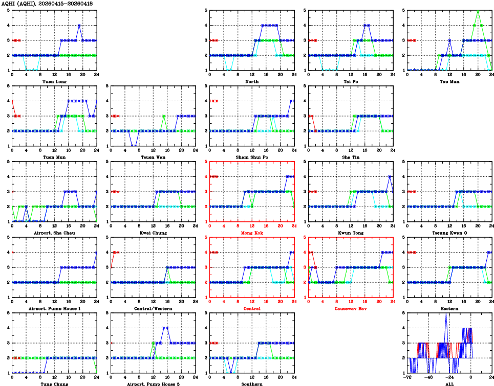| Air Quality Data Time Series for AQHI (2026/04/18) | ( Line colors: Day -3 Day -2 Day -1 Current day ) | 2D Map Current AQHI |