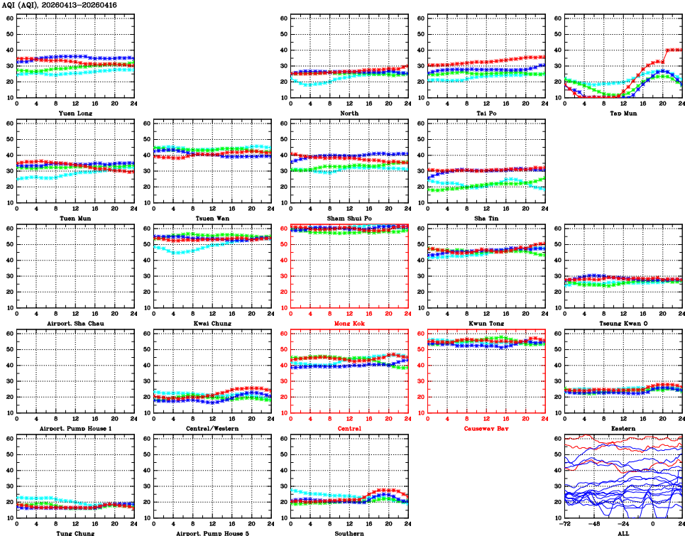 | Air Quality Data Time Series for AQI (2026/04/16) | ( Line colors: Day -3 Day -2 Day -1 Current day ) | 2D Map Current AQHI |