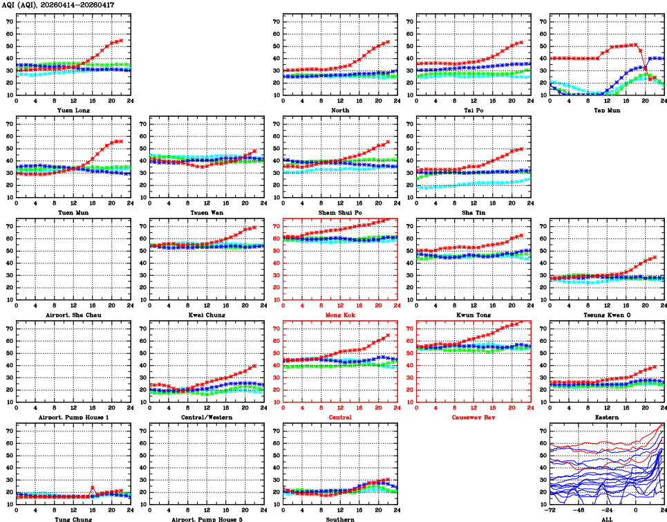 | Air Quality Data Time Series for AQI (2026/04/17) | ( Line colors: Day -3 Day -2 Day -1 Current day ) | 2D Map Current AQHI |