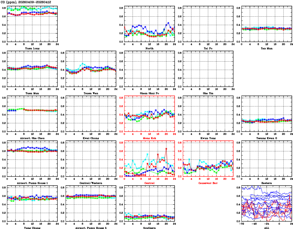 | Air Quality Data Time Series for CO (2026/04/12) | ( Line colors: Day -3 Day -2 Day -1 Current day ) | 2D Map Current AQHI |