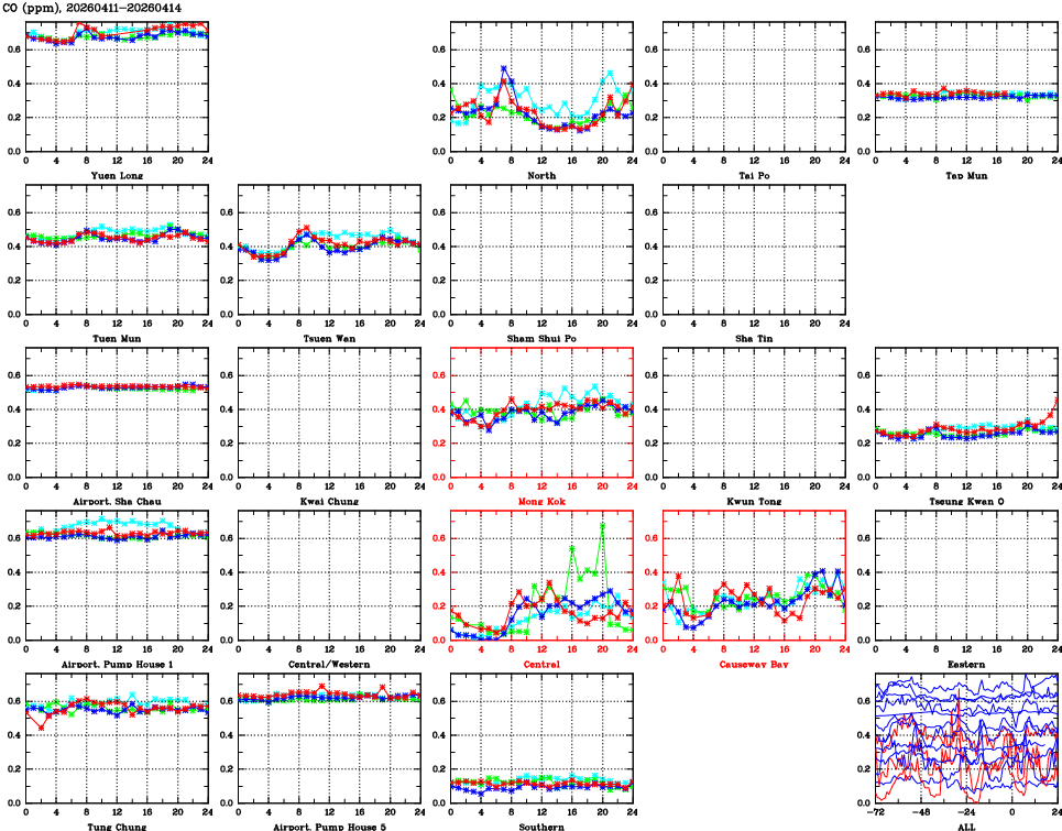 | Air Quality Data Time Series for CO (2026/04/14) | ( Line colors: Day -3 Day -2 Day -1 Current day ) | 2D Map Current AQHI |