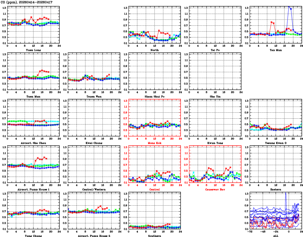 | Air Quality Data Time Series for CO (2026/04/17) | ( Line colors: Day -3 Day -2 Day -1 Current day ) | 2D Map Current AQHI |