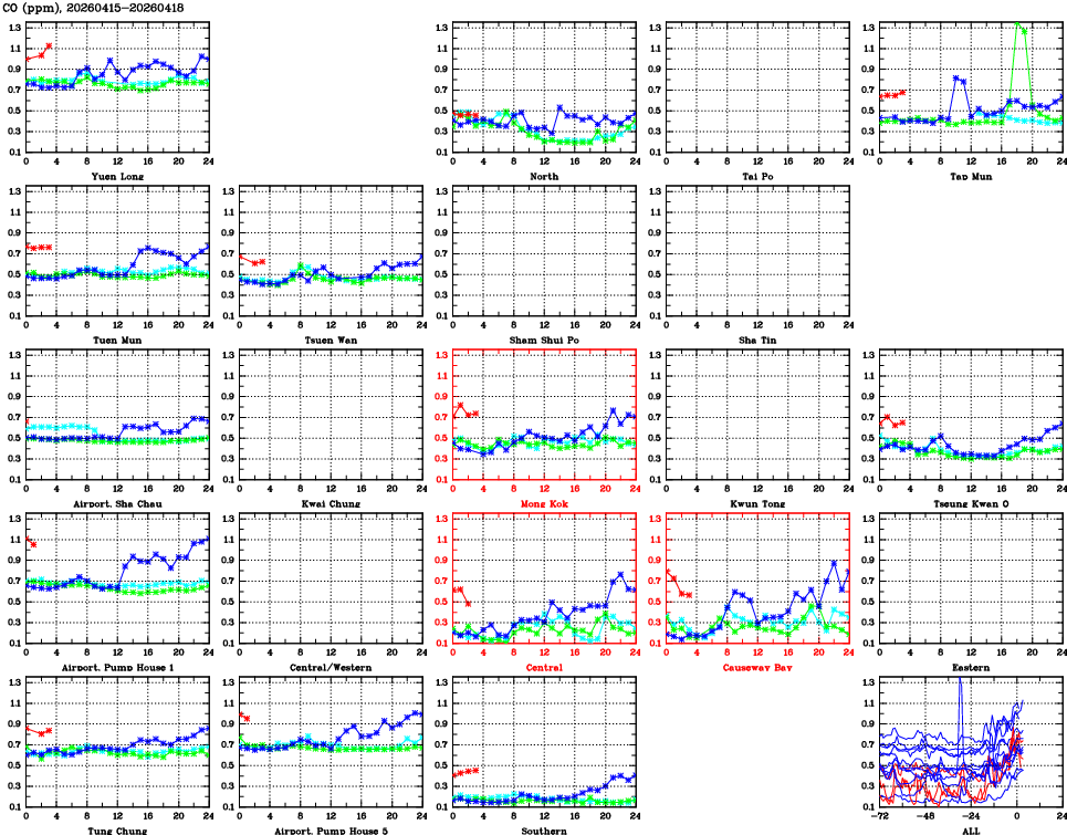 | Air Quality Data Time Series for CO (2026/04/18) | ( Line colors: Day -3 Day -2 Day -1 Current day ) | 2D Map Current AQHI |