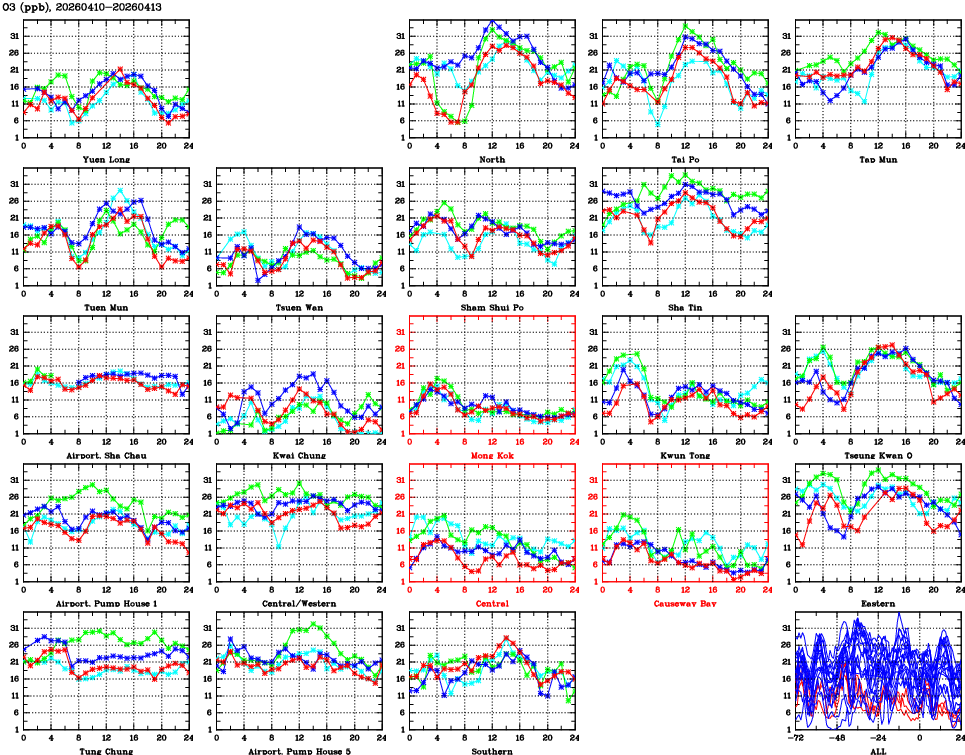 | Air Quality Data Time Series for O3 (2026/04/13) | ( Line colors: Day -3 Day -2 Day -1 Current day ) | 2D Map Current AQHI |