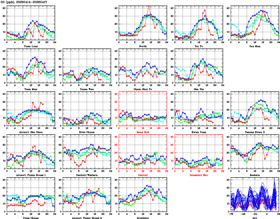 | Air Quality Data Time Series for O3 (2026/04/17) | ( Line colors: Day -3 Day -2 Day -1 Current day ) | 2D Map Current AQHI |
