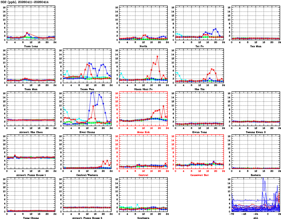 | Air Quality Data Time Series for SO2 (2026/04/14) | ( Line colors: Day -3 Day -2 Day -1 Current day ) | 2D Map Current AQHI |