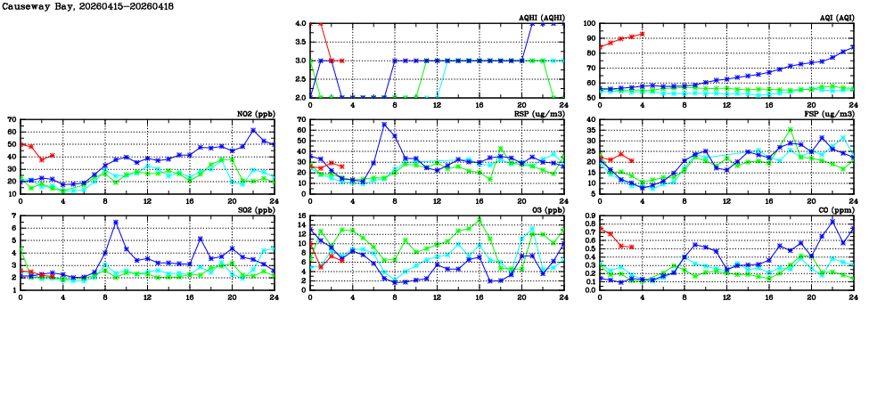 | Air Quality Data Time Series in Causeway Bay (2026/04/18) | ( Line colors: Day -3 Day -2 Day -1 Current day ) | 2D Map Current AQHI |