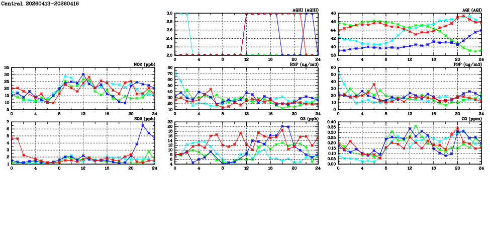 | Air Quality Data Time Series in Central (2026/04/16) | ( Line colors: Day -3 Day -2 Day -1 Current day ) | 2D Map Current AQHI |