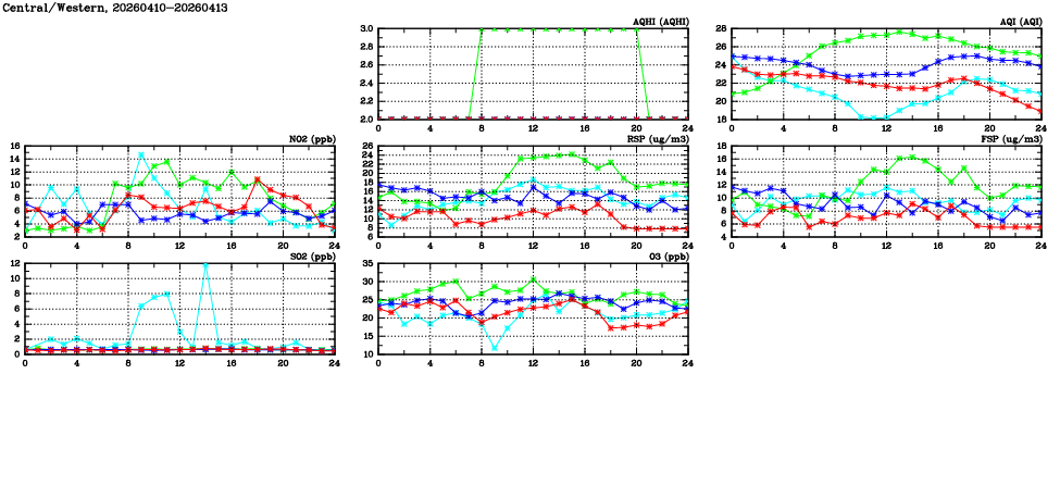| Air Quality Data Time Series in Central/Western (2026/04/13) | ( Line colors: Day -3 Day -2 Day -1 Current day ) | 2D Map Current AQHI |