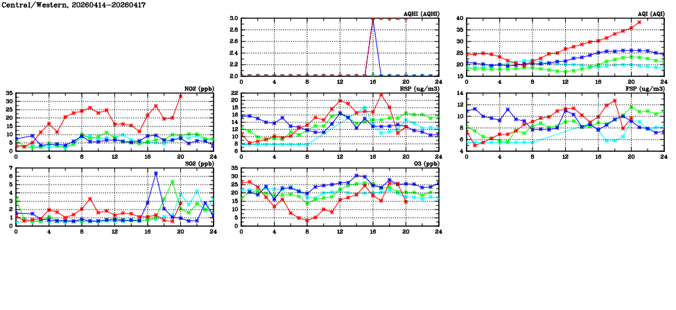 | Air Quality Data Time Series in Central/Western (2026/04/17) | ( Line colors: Day -3 Day -2 Day -1 Current day ) | 2D Map Current AQHI |