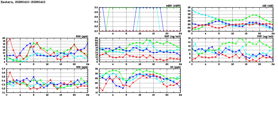 | Air Quality Data Time Series in Eastern (2026/04/13) | ( Line colors: Day -3 Day -2 Day -1 Current day ) | 2D Map Current AQHI |