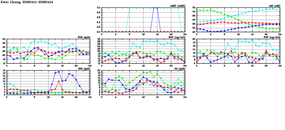 | Air Quality Data Time Series in Kwai Chung (2026/04/14) | ( Line colors: Day -3 Day -2 Day -1 Current day ) | 2D Map Current AQHI |