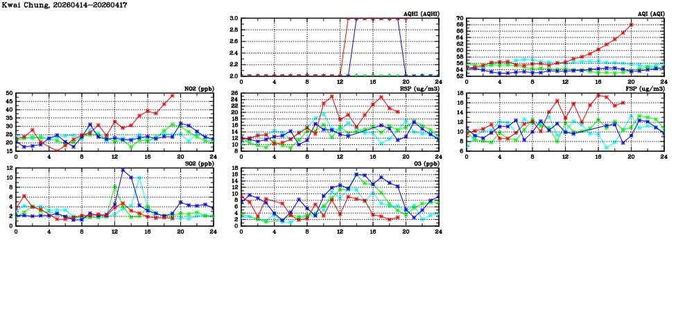 | Air Quality Data Time Series in Kwai Chung (2026/04/17) | ( Line colors: Day -3 Day -2 Day -1 Current day ) | 2D Map Current AQHI |