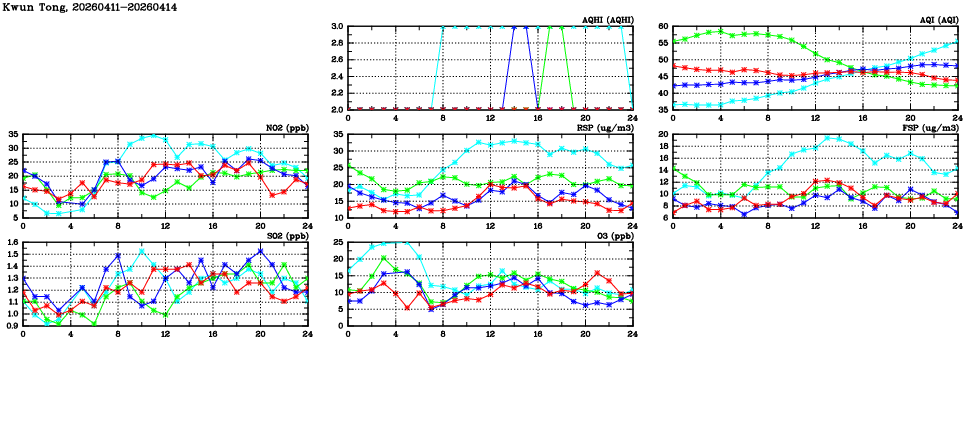 | Air Quality Data Time Series in Kwun Tong (2026/04/14) | ( Line colors: Day -3 Day -2 Day -1 Current day ) | 2D Map Current AQHI |