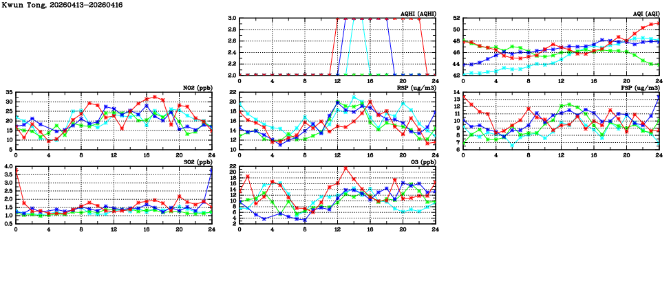| Air Quality Data Time Series in Kwun Tong (2026/04/16) | ( Line colors: Day -3 Day -2 Day -1 Current day ) | 2D Map Current AQHI |