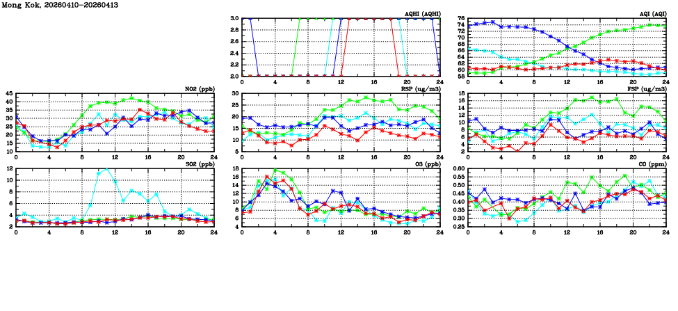 | Air Quality Data Time Series in Mong Kok (2026/04/13) | ( Line colors: Day -3 Day -2 Day -1 Current day ) | 2D Map Current AQHI |