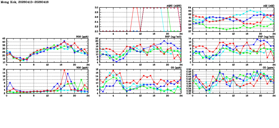 | Air Quality Data Time Series in Mong Kok (2026/04/16) | ( Line colors: Day -3 Day -2 Day -1 Current day ) | 2D Map Current AQHI |