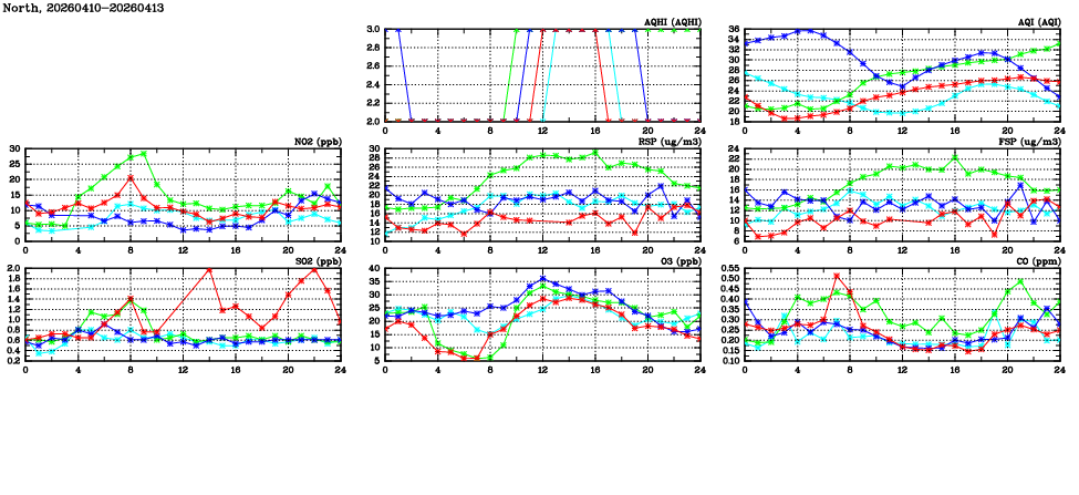 | Air Quality Data Time Series in North (2026/04/13) | ( Line colors: Day -3 Day -2 Day -1 Current day ) | 2D Map Current AQHI |
