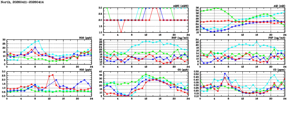| Air Quality Data Time Series in North (2026/04/14) | ( Line colors: Day -3 Day -2 Day -1 Current day ) | 2D Map Current AQHI |