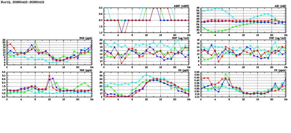 | Air Quality Data Time Series in North (2026/04/15) | ( Line colors: Day -3 Day -2 Day -1 Current day ) | 2D Map Current AQHI |