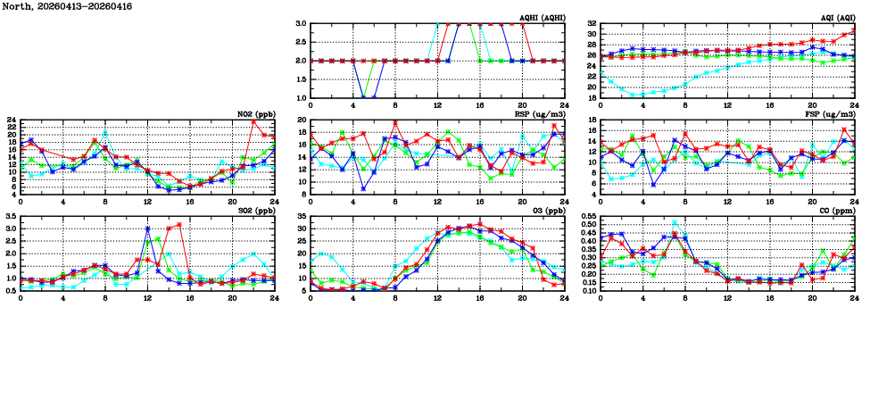 | Air Quality Data Time Series in North (2026/04/16) | ( Line colors: Day -3 Day -2 Day -1 Current day ) | 2D Map Current AQHI |