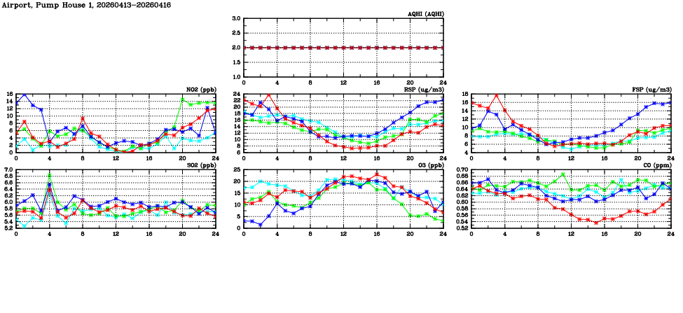| Air Quality Data Time Series in Airport, Pump House 1 (2026/04/16) | ( Line colors: Day -3 Day -2 Day -1 Current day ) | 2D Map Current AQHI |